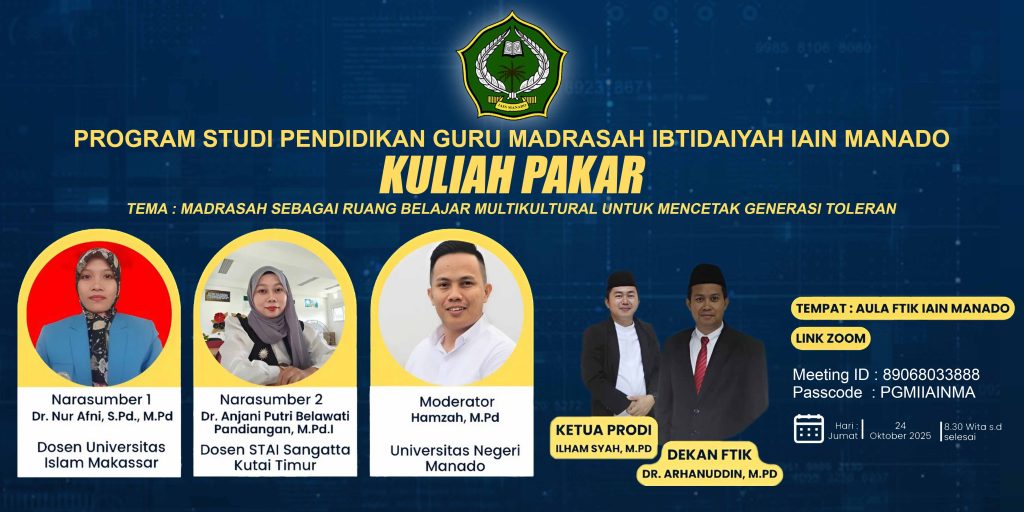 Manado, 24 Oktober 2025 — Program Studi Pendidikan Guru Madrasah Ibtidaiyah (PGMI) Fakultas Tarbiyah dan Ilmu Keguruan (FTIK) IAIN Manado sukses menyelenggarakan Kuliah Pakar dengan tema “Madrasah sebagai Ruang Belajar Multikultural untuk Mencetak Generasi Toleran.”
